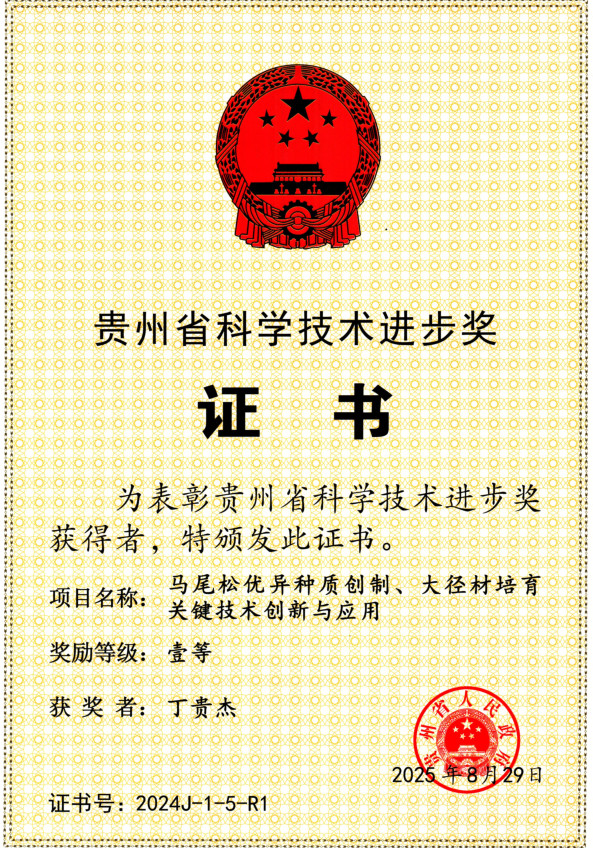| 2 | 马尾松优异种质创新、大径材培育关键技术创新与应用 | 贵州省科技进步一等奖 | 2025.08 | 贵州省人民政府 | 丁贵杰 吴峰 范付华 文晓鹏 赵杨 周运超 | 主持 |