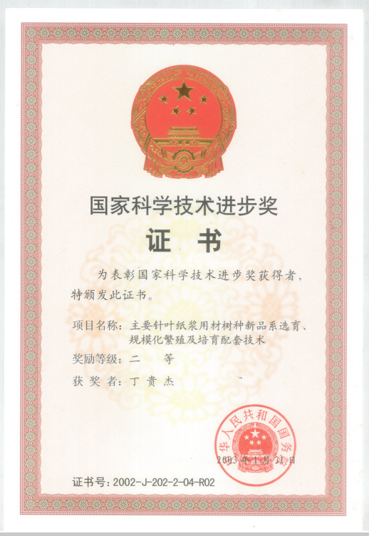 | 2 | 主要针叶纸浆用材树种新品系选育规模化繁殖及培育配套技术 | 国家科技进步二等奖 | 2003.01 | 国务院 | 丁贵杰 谢双喜 | 共同主持 |