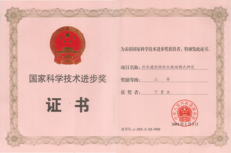 | 3 | 杉木建筑材优化栽培模式研究 | 国家科技进步二等奖 | 2001.01 | 国务院 | 丁贵杰 | 参加 |